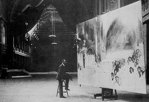 reproduced from the book: However, with time, Roberts seem to lose some of his enthusiasm for the work, and in a letter to S.W. Pring from his studio in the Exhibition Building, Melbourne, Roberts described the work as a '17 foot Frankenstein'. In many ways, Roberts was fortunate to secure the commission, for at that time, due to the poor financial state of the Australian economy and the lack of sales and commissions in the Art world, he was seriously considering leaving Australia for the greener pastures of England. He arrived in Melbourne from Sydney with his wife, Lillie on 5 May 1901, and was invited with his wife to the opening of the First Parliament of the Commonwealth of Australia on 9 May. During the opening ceremony, Roberts placed himself in a favourable vantage point and worked rapidly on a sketch of the 'Opening' in oils on wood panel, 30.5 x 45.8 cm. This sketch is now in the collection of the National Library of Australia in Canberra. As Roberts mentions in the above letter to his son, Caleb, James Clarke Waite was originally offered the commission for the official painting, however as he was unable to accept the offer, Roberts was given the opportunity. On 20 May 1901, he signed the contract to paint the event. The original contract was for 650 guineas for a canvas 152 x 244 cm, however this contract was later increased when it was realized that the canvas would need to be larger to accommodate all the portraits of those who were present, at a size where individuals were distinguishable. The renewed contract was for 1000 guineas for the present canvas, which measures when unframed 304.5 x 509.2 cm. Roberts was also paid one guinea for each life sketch. After the official opening, Roberts travelled to Sydney to work on the Royal portraits. He made a number of pencil sketches in Government House, Sydney, and was later provided with official photographs of the Royal couple from which to work. He later travelled to Brisbane, where he painted the portraits of Lord and Lady Lamington. His contract required him to include correct representations of the Duke and Duchess of Cornwall and York, the Govenor-General, Governors of each State, the Members of both Federal Houses of Parliament and the many distinguished guests from Australia and overseas - 'to the number of not less than 250'. In all, the key to the painting lists 269 names, 11 of which are listed as in the 'Gallery', and out of the 269 names, only 31 are those of women. It is known that Tom Roberts went to great lengths to accurately record the sitters in the painting, even to the keeping of statistics on their weights and measurements. Katrina Rumley, noted that 'The hefty John Forrest refused to reveal his weight to the artist, and Lord Hopetoun said that sitting for his portrait was almost as bad as enduring a heavy opera'. On the other hand, some sitters are known to have approached Roberts with considerable sums of money, to be portrayed in the foreground of the work. It is interesting to note that listed as sitter number 251 in the key to the work, is Tom Roberts close friend and fellow artist. 'Mr Fred McCubbin'. As a tribute to Sir Henry Parkes, the 'Father of Federation' who died in 1896, Roberts included his portrait in his work, on the wall above the official platform. To complete the commission, Roberts was provided with a room within the Exhibition Building in Melbourne, and then in London in 1903, to complete the work, Roberts was provided with the South African Room in the Imperial Institute. Roberts completed the work in London on 16 November 1903, and his relief in finishing the commission was expressed in the drawing accompanying his letter of 6 November, where he notes that the work is close to completion, and draws a bulldog escaping from a collar and chain. The work once completed was sent to Paris for engraving at Goupil & Cie. It remained unsigned by Roberts and undated, unlike his initial sketch in which he scratched in the paint in the lower right of the work 'Tom Roberts'. It is well documented that 'The Big Picture' drained Roberts of much of his artistic energy, and he entered what many have described as his 'black period'. This was brought about by a number of factors, although most could be attributed to the hopeful outcomes of 'The Big Picture' commission not eventuating. Roberts did not receive the accolades that he expected from completing the commission, nor did his work in London for commissions, increase to any extent, even with his close association with the future King and other dignitaries. In all Roberts earned nearly 2000 guineas from the commission, which took two and a half years to complete. Another artist, Charles Nuttall, also produced a work of the Opening of the First Parliament of the Commonwealth of Australia, however, a notice in The Age in July 1903, announced that 'Charles Nuttall's drawing of the Opening does not have official recognition.' The work by Nuttall hangs in the Royal Exhibition Building in Melbourne, while Tom Roberts' official work hangs in Parliament House, Canberra on permanent loan from the British Royal Collection. Left: Arthur Streeton - Above Us The Great Grave Sky, 1890Collection: National Gallery of Australia, Canberra.