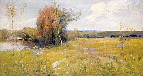 Streeton, or ‘Smike’ as he was known, depicts in this work bathers on a corner of Sill’s Bend on the Yarra River, located in what is now known as Banksia Park. The Yarra River is swollen with heavy Spring rains, and in the distance are cattle grazing on the rich river flats. Streeton was called ‘Smike’ by his friends after a character in the novel ‘Nicholas Nickleby’ by Charles Dickens. Copyright Notice Left: Arthur Streeton